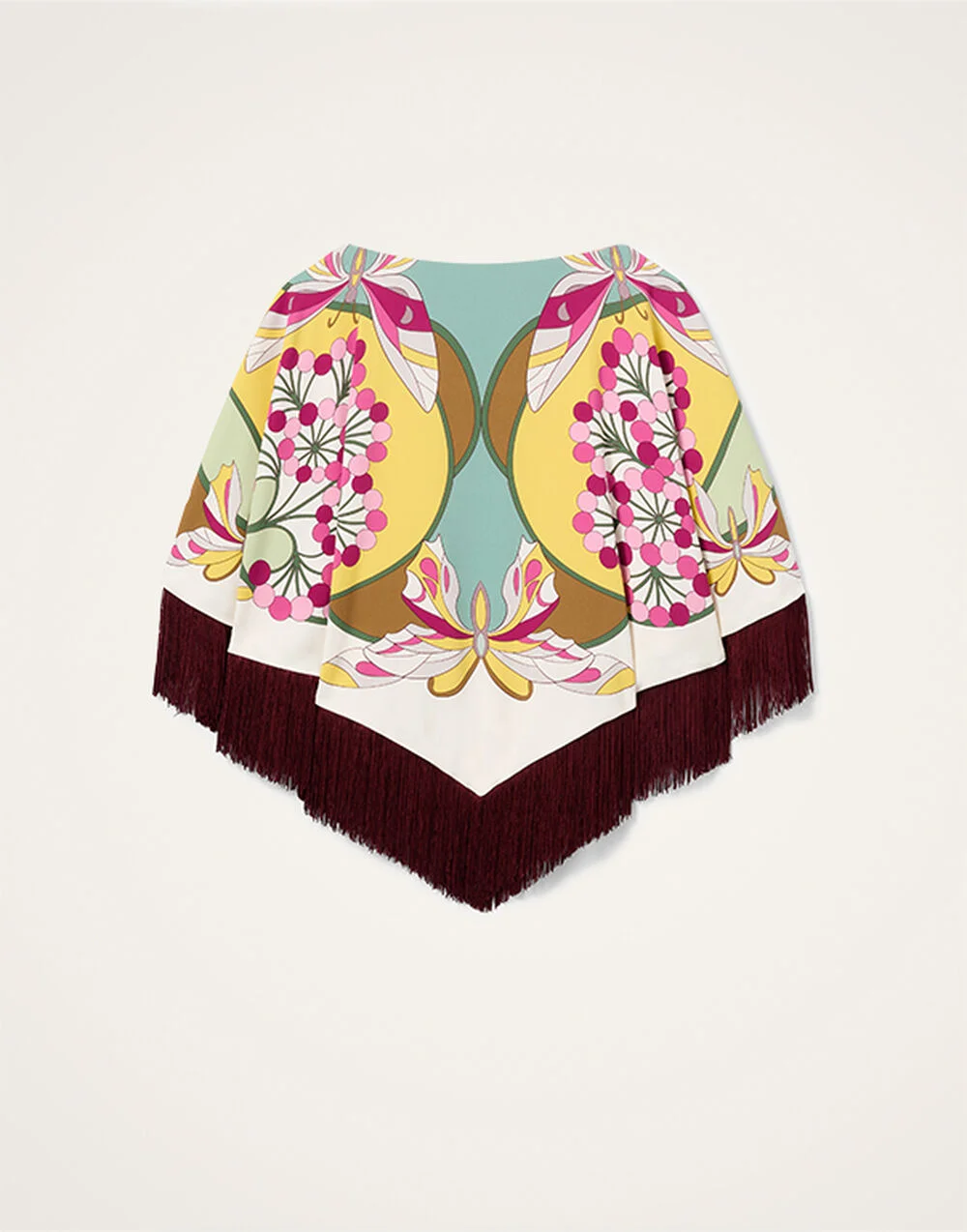 Who says a poncho can't be "piccolo"? Delivered in this sleek Italian satin with a touch of stretch, the Mini Poncho arrives in our hand-placed prints with fringes all along the hem for extra flourish. An easy everyday outfit upgrader you can also lip it over a silk dress at a wedding when the sun goes down for extra wow. Details & Fit - Envers satin - Fringed trims - Reversible - Placed print - Composition: 96% Viscosa 4% Elastane - Made in Italy