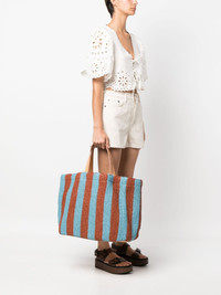 Riviera striped raffia tote bag Crafted from crochet raffia, La DoubleJ's striped Riviera tote bag is presented in a blue and brown colour palette – echoing the Milanese brand's sunny disposition. A generous main compartment adds practicality. Highlights - Sky blue/brown - Crochet raffia design - Leather top handles - Vertical stripe pattern - Main compartment - Unlined Imported Composition Outer: Raffia 100%, Rayon 80%, Leather 20% SIZE & FIT Model measurements Height 5 ft 11 in(1.8 m) Bust/Chest 31.49 in(80 cm) Hips 35.43 in(90 cm) Waist 24.4 in(62 cm) Measurement DEPTH 9.84 in(25 cm) HEIGHT 14.17 in(36 cm) STRAP 7.87 in(20 cm) WIDTH 23.62 in(60 cm)