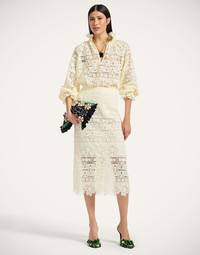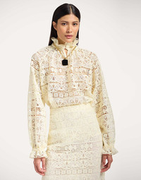 There’s nothing like a little romance to zhuzh up your wardrobe separates. Light, beautiful and unapologetically feminine, the Cerere Blouse enraptures in this glorious Caper macrame. Its vintage-inspired shape appeals to our whimsy side and is finished with a detachable foulard at the collar that can be tied, styled as a belt or let loose. Details & Fit - Caper Macrame - Detachable neck sash secured with loops - V neck - Puff sleeves - 100% Made in Italy - Composition: 100% polyester - The model is 178 cm / 5′ 10″ tall and wears a size S
