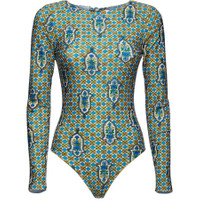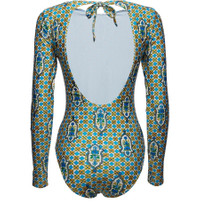 This long-sleeved backless Surf Suit is a major game changer. Sure, you can wear it hanging ten off the Malibu coast, but it can also be your new yoga class BFF or brunch-ready body suit. It's versatile! With long sleeves and a cut out back that ties up at the nape of the neck, it shows perfect amount of peekaboo skin for when you don't feel like baring it all. The leg is low cut so it totally covers the bum, as well. DESCRIPTION - One-piece swimsuit - Round neck - Bow on back - All-over print - Slim fitting DETAILS AND CARE MATERIAL: 80% Polyamide / 20% Elastan COLOR: santachiara COUNTRY OF MANUFACTURE: Italy PRODUCT CODE: LDJX7VR6MU7S2AAA07