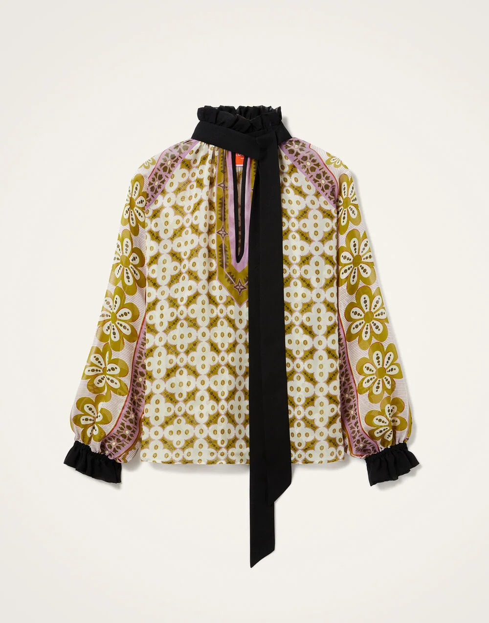 There’s nothing like a little romance to zhuzh up your wardrobe separates. Light, beautiful and unapologetically feminine, the Cerere Blouse is an evening top for your admirers to fall in love with. Its vintage-inspired shape appeals to our whimsy side and is finished with a detachable foulard at the collar that can be tied, styled as a belt or let loose. In this hand-placed print, wear with our matching Pencil Skirt for an elegant wedding look or style to bring slink to your favorite jeans. Details & Fit - Silk chiffon - Hand-placed print - Detachable neck sash secured with loops - V neck - Puff sleeves - Garment length: 62cm - 100% Made in Italy - Composition: 100% Silk - The model is 178 cm / 5′ 10″ tall and wears a size S