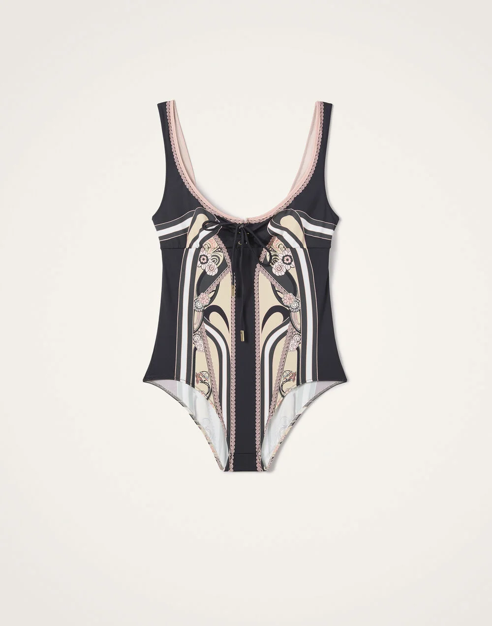 When an acqua to aperitivo situation calls, prepare to stun in the Sunset Suit. This swimsuit has a flattering scoop neck and tie detail in the front that is worthy of your ready-to-wear wardrobe, yet it’s cut in functional Italian-made Lycra that is the best in the biz. Featuring this molto elegante Ambrosia print placed by hand, it’s perfect for lounging wherever you want to be seen. Details & Fit - Garment fit: fitted - Supreme lycra - Placed print - 74% Polyamide 26% Elastane - Fully lined - Made in Italy - The model is 177 cm / 5′ 9.7″ tall and wears a size S