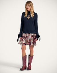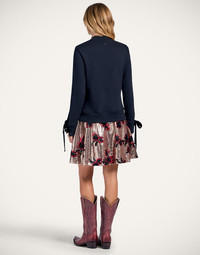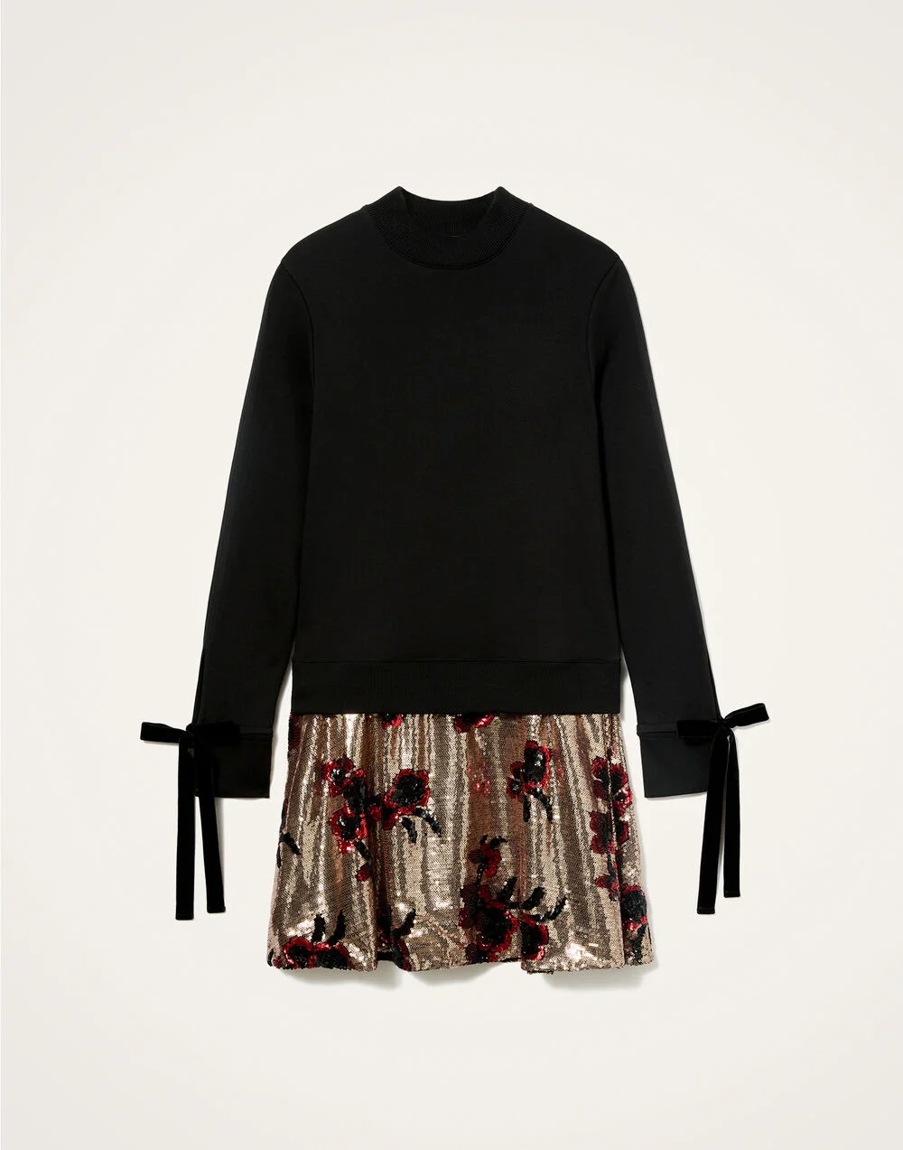 The Sporty Dress puts a cute style spin on the humble sweatshirt so you don’t have to. Done in our soft 100% cotton felpa, the sweatshirt part does the casual-comfy-cosy thing, while the paillettes embroidered flippy skirt adds a fabulously flirty touch. As for the details, we love that mock neckline and ribbons on the sleeves you can tie or let loose. It’s cute for city cocktails, but perfect for office to office party panache. You know we love a little high-low mix. Details & Fit - Sweatshirt top made from cotton felpa - Attached miniskirt made from embroidered paillette sequins - Mock neckline - Ribbons on sleeves - Composition: 80% Cotton 20% Polyester - 100% Made in Italy - The model is 180 cm / 5′ 11″ tall and wears a size S