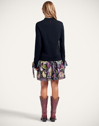The Sporty Dress puts a cute style spin on the humble sweatshirt so you don’t have to. Done in our soft 100% cotton felpa, the sweatshirt part does the casual-comfy-cosy thing, while the silky twill flippy skirt adds a flirty touch. As for the details, we love that mock neckline and ribbons on the sleeves you can tie or let loose. Enchanting in this intricate Fun-Gi print, it’s as cute for city cocktails as it is easy for a casual Sunday. You know we love a little high-low mix. Details & Fit - Sweatshirt top made from cotton felpa - Attached miniskirt made from silky twill - Mock neckline - Ribbons on sleeves - 100% Made in Italy - Composition: 80% Cotton 20% Polyester - Garment length 85cm - The model is 180 cm / 5′ 11″ tall and wears a size S