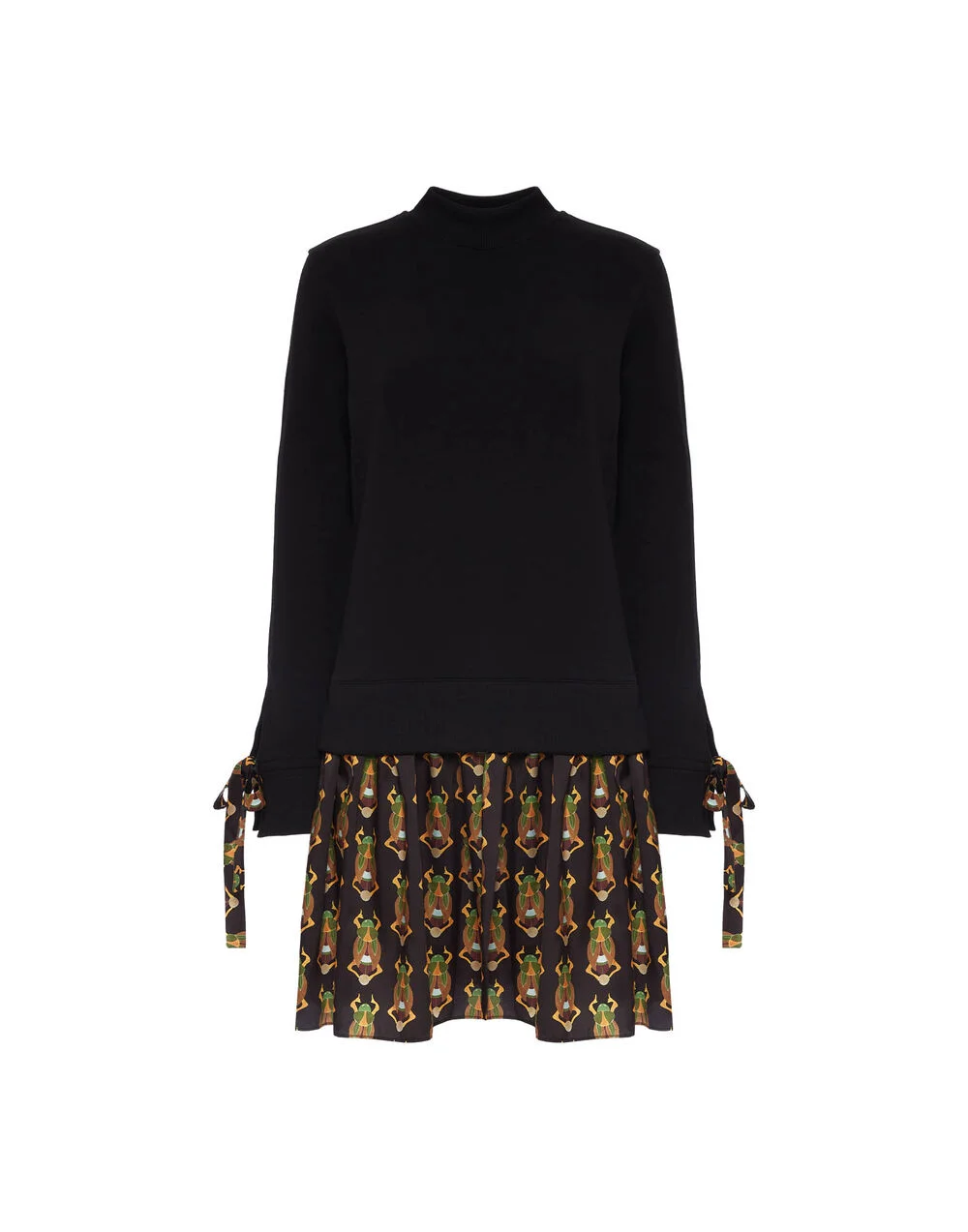 The Sporty Dress puts a cute style spin on the humble sweatshirt so you don’t have to. While its black sweatshirt top does the casual-comfy-cosy thing, the silky twill flippy skirt in our enchanting Scarab print adds a flirty, dressy touch. As for the details, we love that mock neckline and ribbons on the sleeves you can tie or let loose. It’s cute for city cocktails, but just as easy for a casual Sunday. You know we love a little high-low mix. Details & Fit - Black sweatshirt top made from 100% cotton - Attached miniskirt made from silky twill - Mock neckline - Ribbons on sleeves - 100% Made in Italy - Composition: 100% Cotton + 100% Polyester - The model is 181 cm tall and wears a size S - Garment length: 85cm