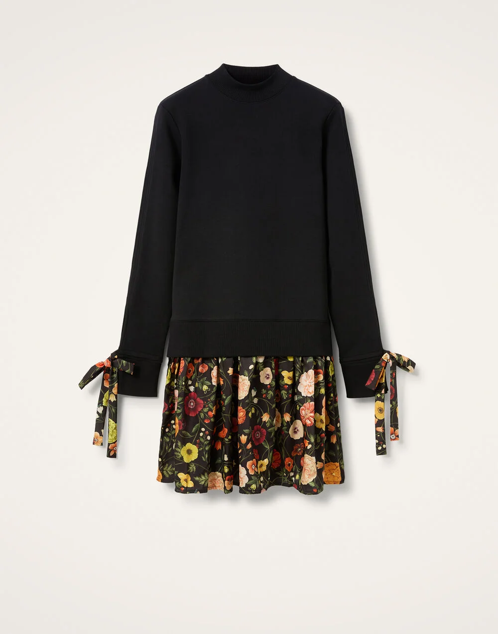 The Sporty Dress puts a cute style spin on the humble sweatshirt so you don’t have to. Done in our soft 100% cotton felpa, the sweatshirt part does the casual-comfy-cosy thing, while the silky twill flippy skirt adds a flirty touch. As for the details, we love that mock neckline and ribbons on the sleeves you can tie or let loose. Finished in this vintage Arcturus print, it’s as cute for city cocktails as it is easy for a casual Sunday. You know we love a little high-low mix. Details & Fit - Black sweatshirt top made from cotton felpa - Attached miniskirt made from silky twill - Mock neckline - Ribbons on sleeves - 100% Made in Italy - Composition: 100% Polyester