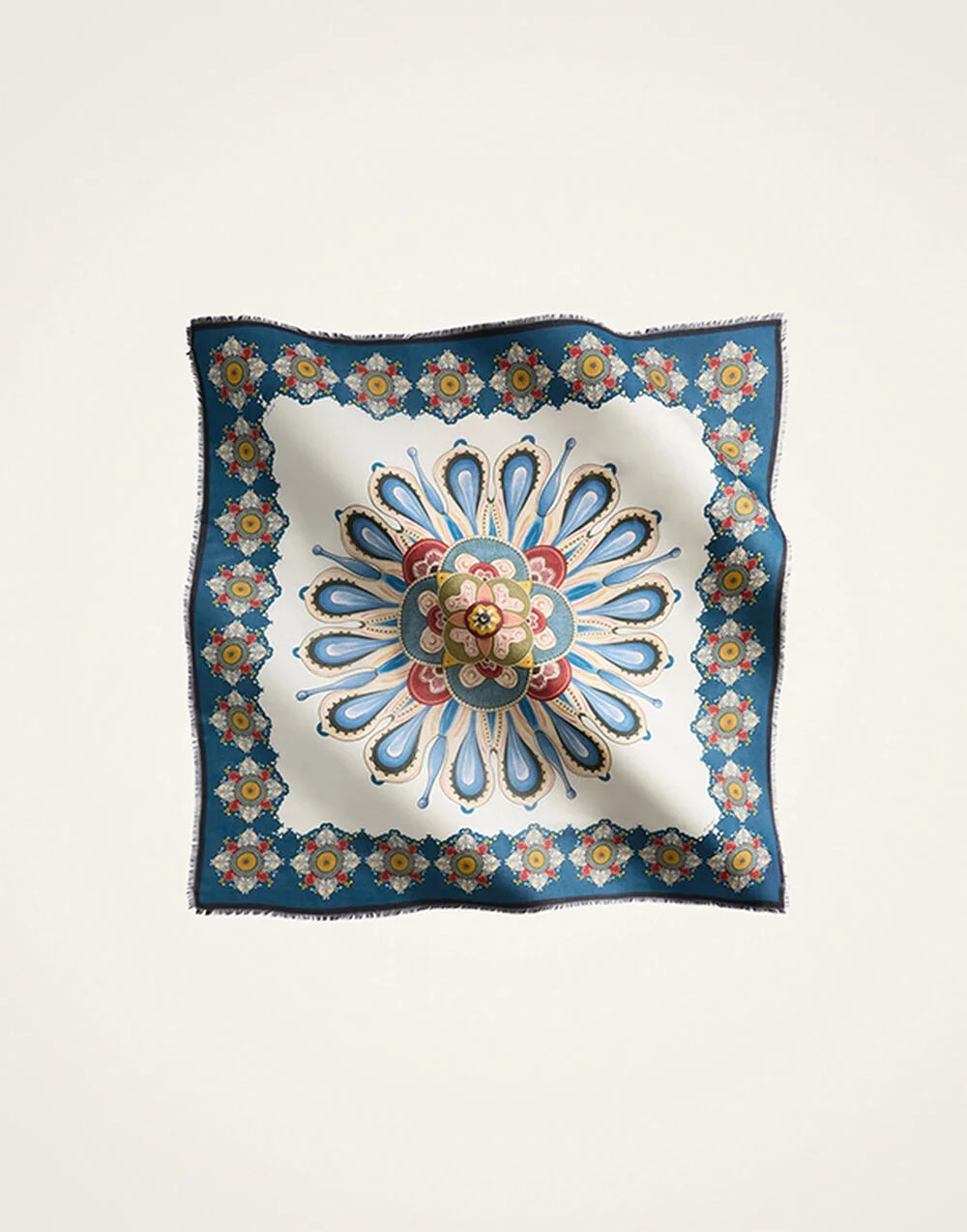La dolce vita meets the Divine with this energy-elevating and fabulously fashion-forward foulard. The ultimate Italian accessory, this piece is the oldest trick in the Milanese Sciura style book, always stashed in a handbag to be folded around the hair, wrapped loosely into a crisp shirt collar, or wrapped across the shoulders during your evening meditation practice. This iteration arrives in our bountiful Nucleus print, a kaleidoscopic explosion of cells inspired by the magical matter that makes up all of Mother Earth's beings. Details & Fit - Modal Silk blend - Frayed fringe edge - Placed print - Composition: 85% Modal 15% silk - Made in Italy - Measures 140 x 140cm