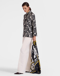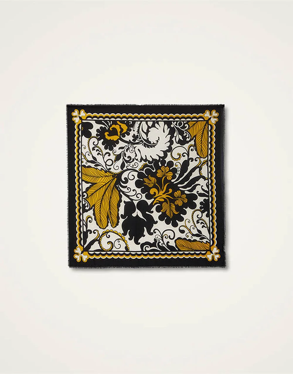The ultimate Italian accessory for any It girl, this piece is the oldest trick in the Milanese Sciura style book, always stashed in a handbag to be folded around the hair, wrapped loosely into a crisp shirt collar, or tied onto a wrist, or ponytail. Adorned with our stunning hand-placed prints and crafted in a light silk-blend mix. Take a cue from the Italians and tie this beauty loosely around the neck or bag strap for instant "Parisienne-in-Puglia" cool. Details & Fit - Modal Silk blend - Frayed fringe edge - Placed print - Composition: 85% Modal 15% silk - Made in Italy - Measures 140 x 140cm