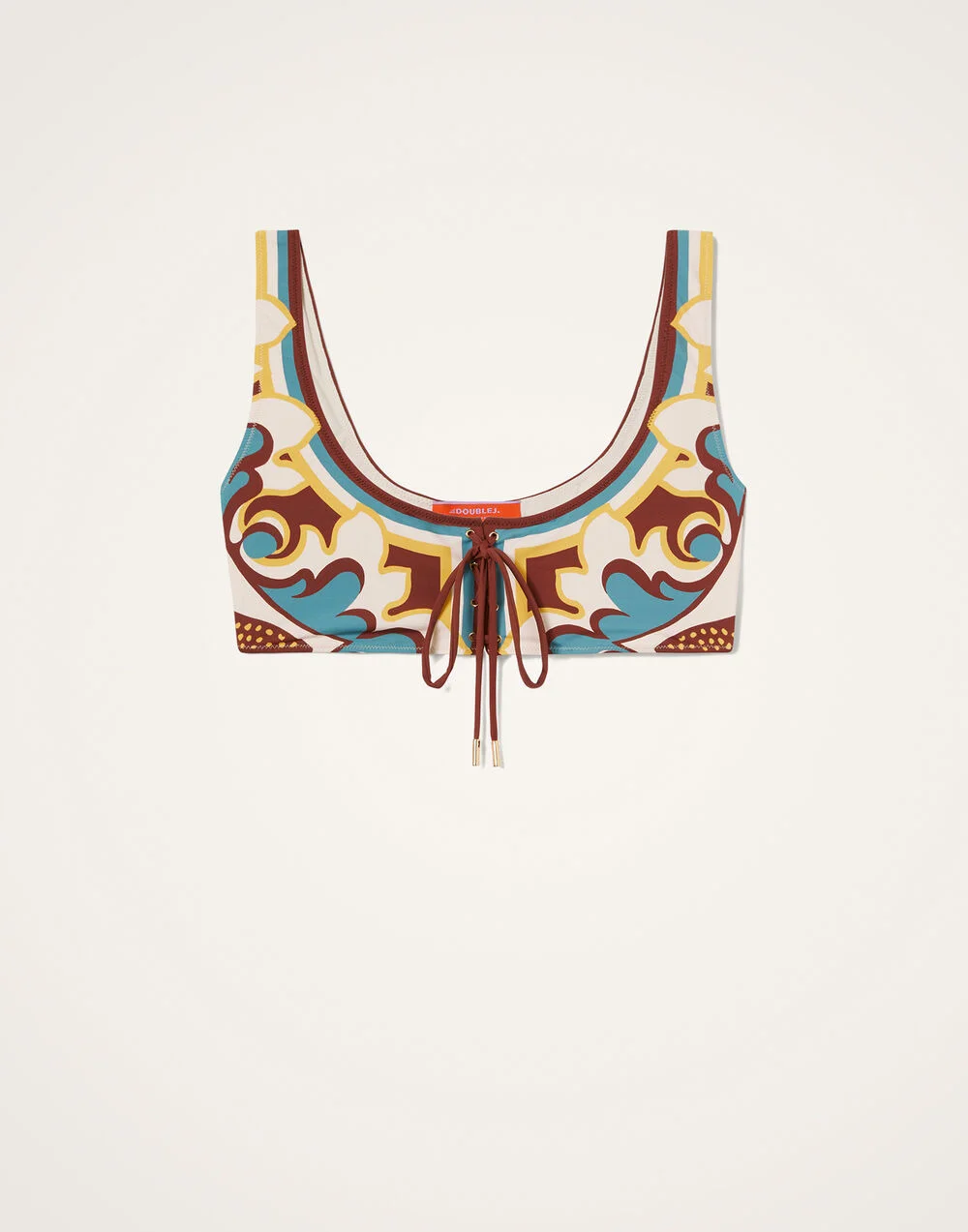 A megawatt bikini top that puts the sun in stun thanks to this exquisite print hand-placed by our Italian artisans. Made for babes of all shapes and sizes, the Sunset features a flattering round neck with chic wide straps plus a flirty tie detail in the front. At its best matched with the Sunset Bikini Bottoms, we’d recommend wearing this somewhere hot, exotic and totally fabulous. Details & Fit - Supreme Lycra - Hand-placed print - Scoop neck - Tie detail in front - Wide straps - 100% Made in Italy - Composition: 74% Polyamide 26% Elastane - The model is 178 cm / 5′ 10″ tall and wears a size S