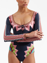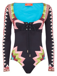 Sunset geometric-print one-piece La DoubleJ's penchant for vintage-inspired designs is evident in the vibrant construction of this navy blue swimsuit. Crafted from a quick-drying, stretch swim fabric, it's decorated with a vivacious geometric print that has been hand-placed by Italian artisans. Highlights - Navy blue/multicolour - Stretch-design - Geometric print - Scoop neck - Front tie fastening - Long sleeves - Be mindful to try on swimwear over your own garments. Made in Italy Composition Polyamide 74%, Elastane 26%