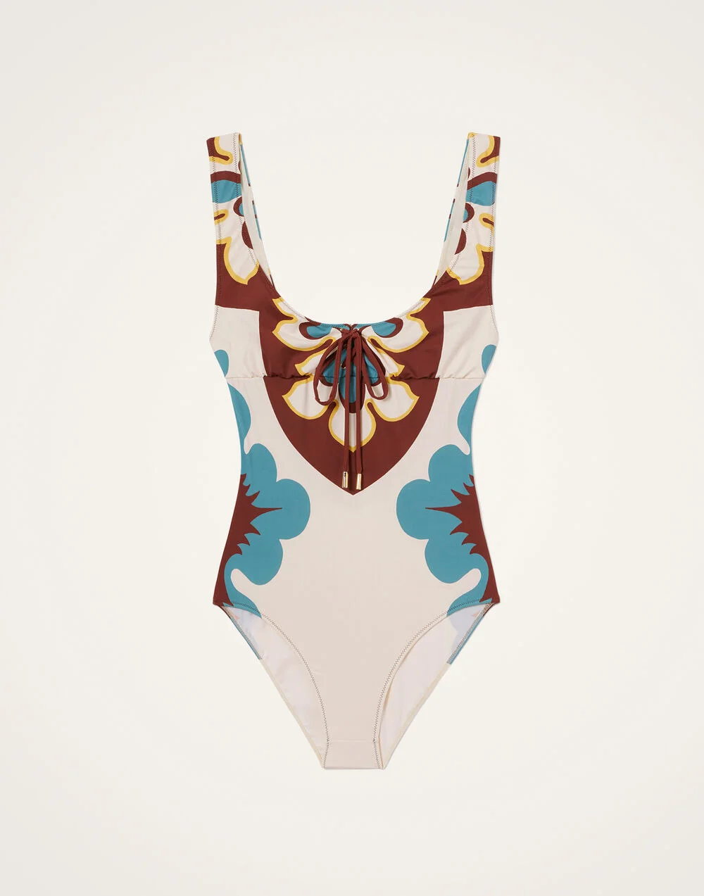 When an acqua to aperitivo situation calls, prepare to stun in the Sunset Suit. Arriving in our hand-placed Palazzo print, this swimsuit has a flattering scoop neck and tie detail in the front that is worthy of your ready-to-wear wardrobe, yet it’s cut in functional Italian-made Lycra that is the best in the biz. Perfect for lounging wherever you want to be seen, slip on the matching Sunset Skirt to take it out-out after. Details & Fit - Supreme Lycra - Hand-placed print - Sleeveless - Scoop neck - Tie detail in front - Medium coverage on butt - 100% Made in Italy - Composition: 76% Polyamide 24% Elastane - The model is 178 cm / 5′ 10″ tall and wears a size S