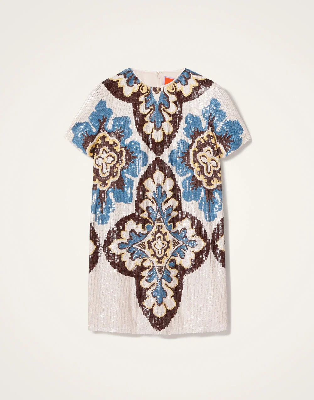 Take our signature Swing Dress, give it a generous chop and voila! You’ve got the Mini Swing. The shorter version of this easy T-shirt silhouette falls around mid-thigh, perfect for La DoubleJ’s more petite fans or for showing off your legendary legs. Crafted for cocktail parties and date nights with embroidered textured sequins across is, we like it styled with polished pins and white sneakers in summer, and with black tights and platforms in winter. Details & Fit - Embroidered sequins - Slim in the shoulders, generous in the hips - Classic T-shirt silhouette - Falls into an A-line - Mini length - Hidden side slit pockets - Concealed back zipper - 100% Made in India - Composition :60% Nylon 40% PVC - Garment length: 80cm - The model is 178 cm / 5′ 10″ tall and wears a size S