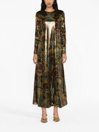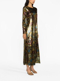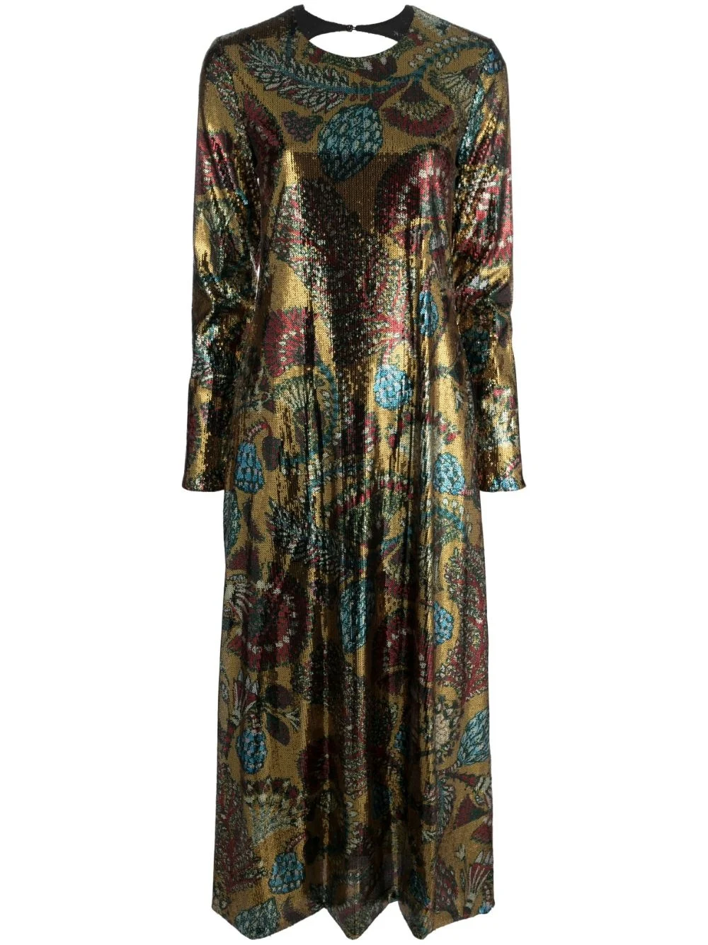 Swank sequinned floral-print dress La DoubleJ's graphics, like the moody-hued art deco-inspired Sicomore florals on this Swank dress, lend its modern silhouettes a distinctly nostalgic air. The demure silhouette is boldly enlivened with a wash of sequins and cut-out reverse for a shimmering and back-baring twist. Highlights - Dark yellow - Multicolour - All-over floral print - Sequin design - Crew neck - Single rear button fastening - Long sleeves - Keyhole detail to the rear - Ankle-length Made in Italy Composition Polyester 100% SIZE & FIT Model measurements Height 5 ft 10 in(1.78 m) Bust/Chest 31.49 in(80 cm) Hips 35.03 in(89 cm) Waist 23.62 in(60 cm) FittingInformation Designed for a slim fit that sits just away from the body offering a close yet comfortable fit Made from a midweight fabric This piece fits true to size – take your usual size Washing instructions Dry Clean Only