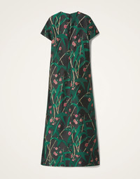 There’s nothing quite like your first love. For us, that’s the Swing Dress, our first silhouette which we’ve reimagined in luxurious textiles and intricate embroideries. Same classic A-line shape, same slip shoulders, same effortless elegance… Just now with more structure, substance and sparkle for an elevated take on our best-selling dress. Our Bamboo print version arrives in this stunning jacquard woven with shimmering fibres for a sultry evening look that's black but not boring. Details & Fit - Jacquard - Slim in the shoulders, generous in the hips - Classic T-shirt silhouette - Falls into an A-line - Long maxi length - Hidden side slit pockets - Concealed back zipper - 100% Made in Italy - Composition: 50% Polyester 25% Silk 19% Viscose 5% Metal Polyester - The model is 180 cm / 5′ 11″ tall and wears a size S