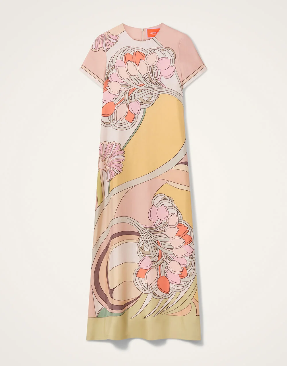 There’s nothing quite like your first love. For us, that’s the Swing Dress - our first silhouette which we’ve reimagined in luxurious textiles and intricate embroideries for an elevated take on our best-selling dress. Same classic A-line shape, same slip shoulders, same effortless elegance. Crafted in glossy Italian silk twill, this beautiful iteration is strewn with our hand-placed Tulip print, meant to whisk you away to Italy’s most romantic gardens every time you slip it on. Gorgissima. Details & Fit - Garment fit: regular - Silk twill - Slim in the shoulders, generous in the hips - Classic T-shirt silhouette - Falls into an A-line - Hidden side slit pockets - Concealed back zipper - Placed print - 100% Silk - Unlined - Made in Italy - Garment length: 135cm