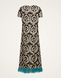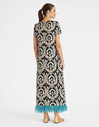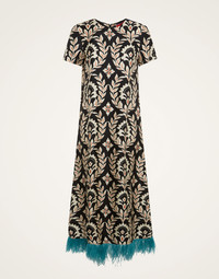 You never forget your first love and this is the story of our Swing Dress. LDJ’s very first model, this easiest of silhouettes is cut slim in the shoulders, generous in the hips, to be adored by babes of all ages. Done in our fluid silk twill that doesn’t cling a bit, it’s finished with a fabulous contrast feather trim that honestly finds a fan club wherever you take it. With its understated T-shirt silhouette and this elegant Ghirlanda print, anything goes. Details & Fit - Silk twill - Hemline trimmed with ostrich feathers - Slim in the shoulders, generous in the hips - Classic T-shirt silhouette - Falls into an A-line - Hits just above the ankles - Hidden side slit pockets - Concealed back zipper - 100% Made in Italy - Composition: 98% Silk 2% Ostrich Feathers - The model is 179 cm tall and wears a size S - Garment length: 135cm