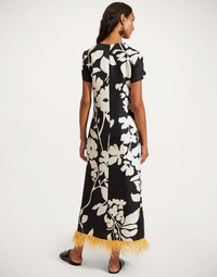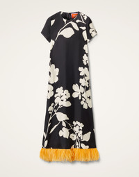 You never forget your first love and this is the story of our Swing Dress. LDJ’s very first model, this easiest of silhouettes is designed to take you from Sunday breakfast to a snappy desk job and all the way through cocktails. We’ve crafted it from our substantial silk twill that doesn’t cling and cut it slim in the shoulders, generous in the hips. More fabulous did you say? For the new season we’ve added a mega ostrich feather trim to rocket your wardrobe to an altogether higher vibration! Details & Fit - Unlined silk twill from Lake Como - Hemline trimmed with ostrich feathers - Slim in the shoulders, generous in the hips - Classic T-shirt silhouette - Falls into an A-line - Hits just above the ankles - Hidden side slit pockets - Concealed back zipper - 100% Made in Italy - Composition: 97% Silk 3% Ostrich Feathers - Model is 180 cm / 5'9" and wears size S | Chest: 78 cm / 31 in | Waist: 61 cm / 24 in | Hips: 89 cm / 35 in - Garment length: 135cm