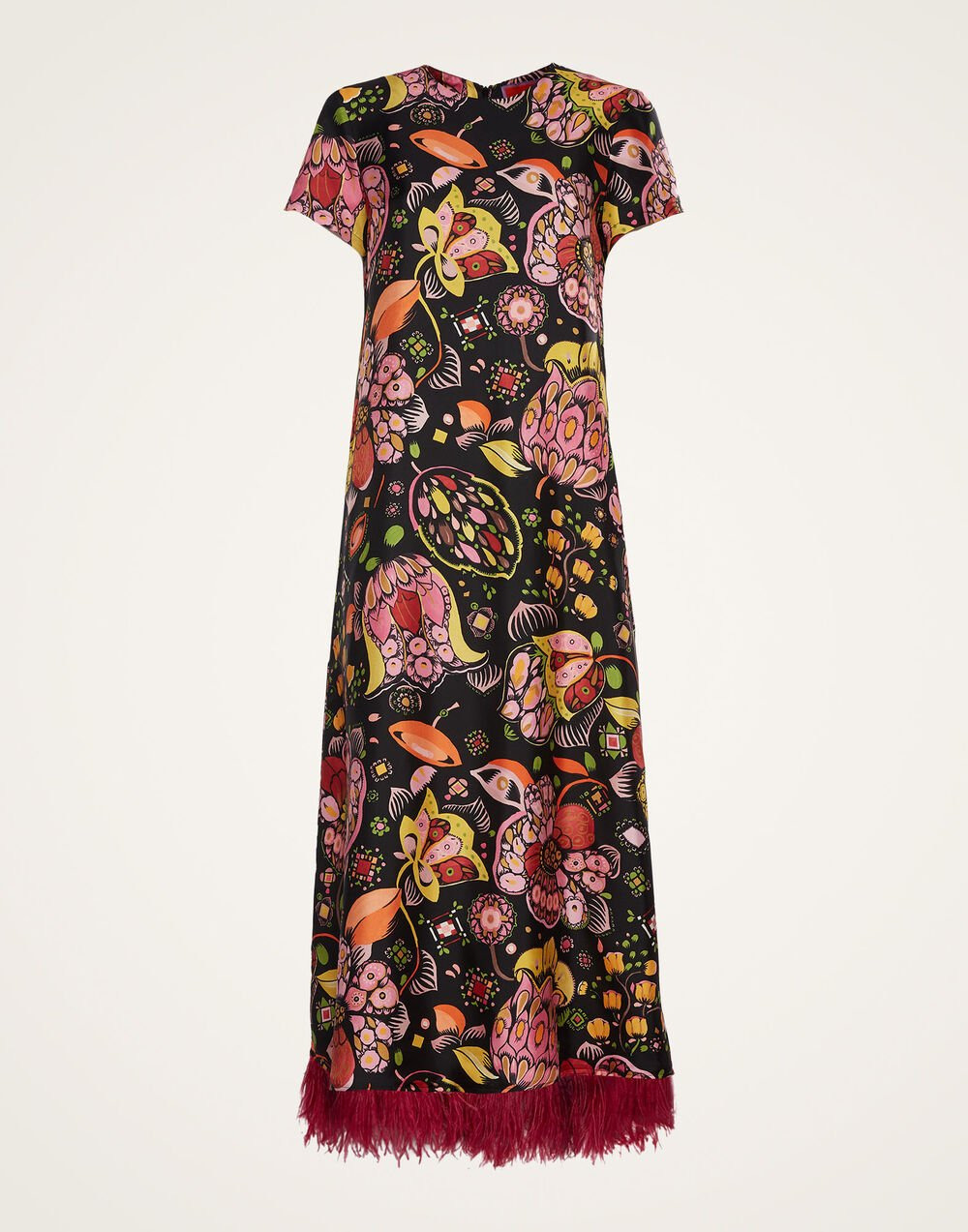 LDJ’s iconic Swing Dress takes a twirl in the spotlight hemmed with an all-new ostrich feather trim. Balancing cool and classy with its easy T-shirt silhouette and ankle-skimming feather flourish, it’s the sort of dress you reach for when you want to bring a little sass to the situation. Think Bar Basso evening cocktails or a fancy graduation lunch. Also ravishing: its fluid and flowy silk twill fabrication. Details & Fit - Silk twill - V neckline - Asymmetric cut - Ostrich feather trim - Pull-on - 100% Made in Italy - Composition: 95% Silk 5% Ostrich Feathers - Model is 180 cm / 5'9" and wears size S | Chest: 82 cm / 32 in | Waist: 63 cm / 25 in | Hips: 88 cm / 35 in