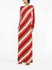 Swing striped knit maxi dress La DoubleJ's first silhouette, the Swing dress is reimagined with bold diagonal stripes, in keeping with the brand's maximalist aesthetic. It's cut from a soft blend of merino and silk to an A-line silhouette, that skims the waist and flares out to the ankles. Highlights - Red/multicolour - Merino wool - Knitted construction - Diagonal stripe pattern - Rear logo detail - Boat neck - Long sleeves - Side slit - Maxi - Straight hem Made in Italy Composition Merino 75%, Silk 25% SIZE & FIT Model measurements Height 5 ft 10 in(1.78 m) Bust/Chest 29.92 in(76 cm) Hips 34.64 in(88 cm) Waist 23.62 in(60 cm) FittingInformation Designed for a relaxed fit, this piece allows for comfort and movement when worn Made with a midweight knit, this piece offers some stretch This piece fits true to size – take your usual size Washing instructions Machine Wash