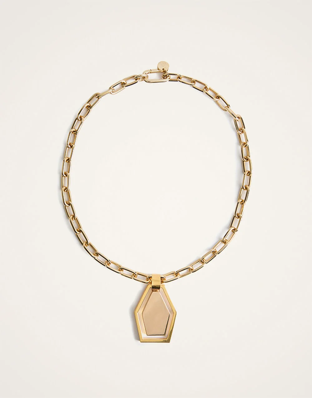 Sure, this golden brass Swinging Portal Necklace makes for a striking addition to any outfit, but we like to think of it as a little joy portal to your soul, sitting ver your heart. Layer it up with necklaces from your own collection, amplify it with some of our precious stone embedded accessories, or leave it solo for a subtler statement. The portal is your entry point to higher states of consciousness, so these designs are reminders of that, intended to keep you connected to your higher consciousness. Details & Fit - Portal Pendant necklace - 24K Gold Plated Brass - Adjustable Chunky Chain is 55cm - Composition: 100% brass - Made in Italy