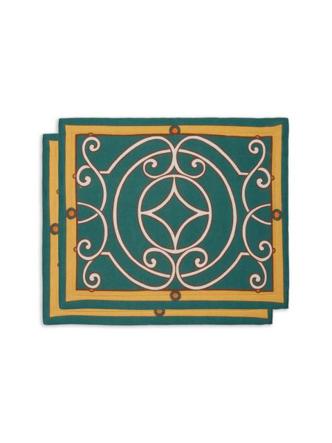 DETAILS AND INSIGHT La Doublej tablemat set of 2 in farfalle. Made in collaboration with historic Italian textile producer Mascioni, our 100% linen placemats come in sets of two. The placemats are slightly padded and have beautifully stitched borders, with a discreet logo on the reverse side. Each is printed in a range of vintage patterns and all can be mixed and matched with our different tablecloths or napkins for a true maximalist dining experience! Treat these babies with care: our bellissimo Italian-made linen has natural irregularities, such as small knots in the yarn, but for us that doubles the charm. Linen cotton from Lake Como. Machine wash warm (do not bleach). 35cm x 45cm. Made in Italy Style TBM0001-LIN001-PAN0002_HW7