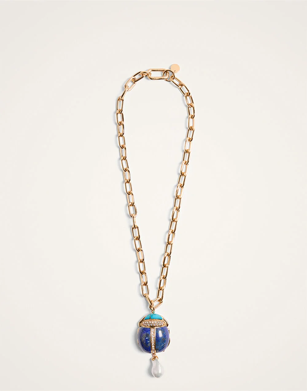 We like our accessories to be more than just eye-catching - we want them to be vibrating with good energy too! This statement Talismania necklace arrives in 24k gold plate and in precious Lapis Lazuli, which is said to stimulate the third eye chakra, activating intuition and spiritual awareness. We love it layered with our other joy jewels to amplify the energy enhancement. Details & Fit - 24k Gold plated Brass and lapislazzuli - 65% Brass 15% Lapislazzuli 10% Natural Pearl 5% Crystal 5% Blue Howlite - Made in Italy - Adjustable Chunky Chain is 55cm