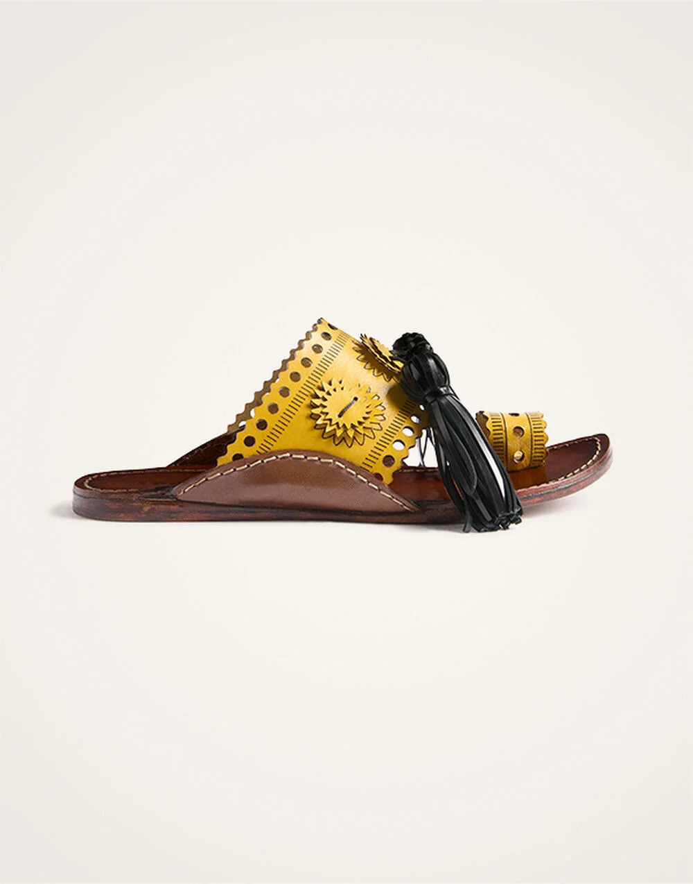 In our devotion to delivering clothes that amplify your energy from head to toe, we've crafted some exquisite sandals for your next sunny getaway. Adorned with intricate tassels in contrast colors, these beauties arrive with a molded footbed - but note! The exquisite leather is stiff to begin with, but after a few wears, it adjusts to your arches for maximum comfort and chic. You wouldn't expect anything less from a country famed for its fabulous footwear, now would you? Details & Fit - Leather sandal - Tassels - Mid strap - Toe strap - Moulded footbed - Made in India - Composition: 100% Vacchetta Crust