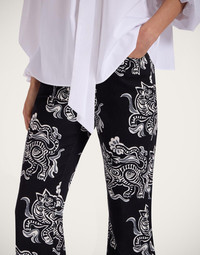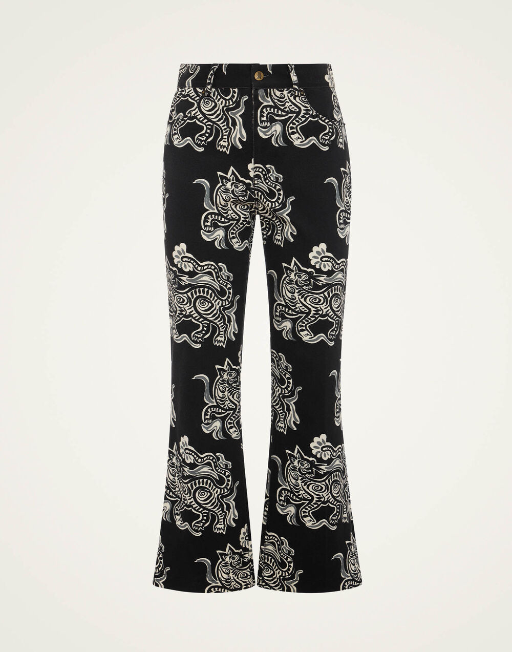 Haven’t you heard? Shins are in, sister! We took our best-selling flare jean and cropped it - same super high waist and booty-boosting shape, same perfect amount of stretch, now with the mood-boosting designs of our latest collections, applied using an intricate laser-print technique. Details & Fit - Laser-printed stretch denim - High waist - Button fly and zip closure - Wide flare - Pockets in front with fifth internal piccolo pocket - Embroidered back pockets - 100% Made in Italy - Composition: 98% Cotton 2% Elastane - The model is 180 cm / 5′ 11″ tall and wears a size S