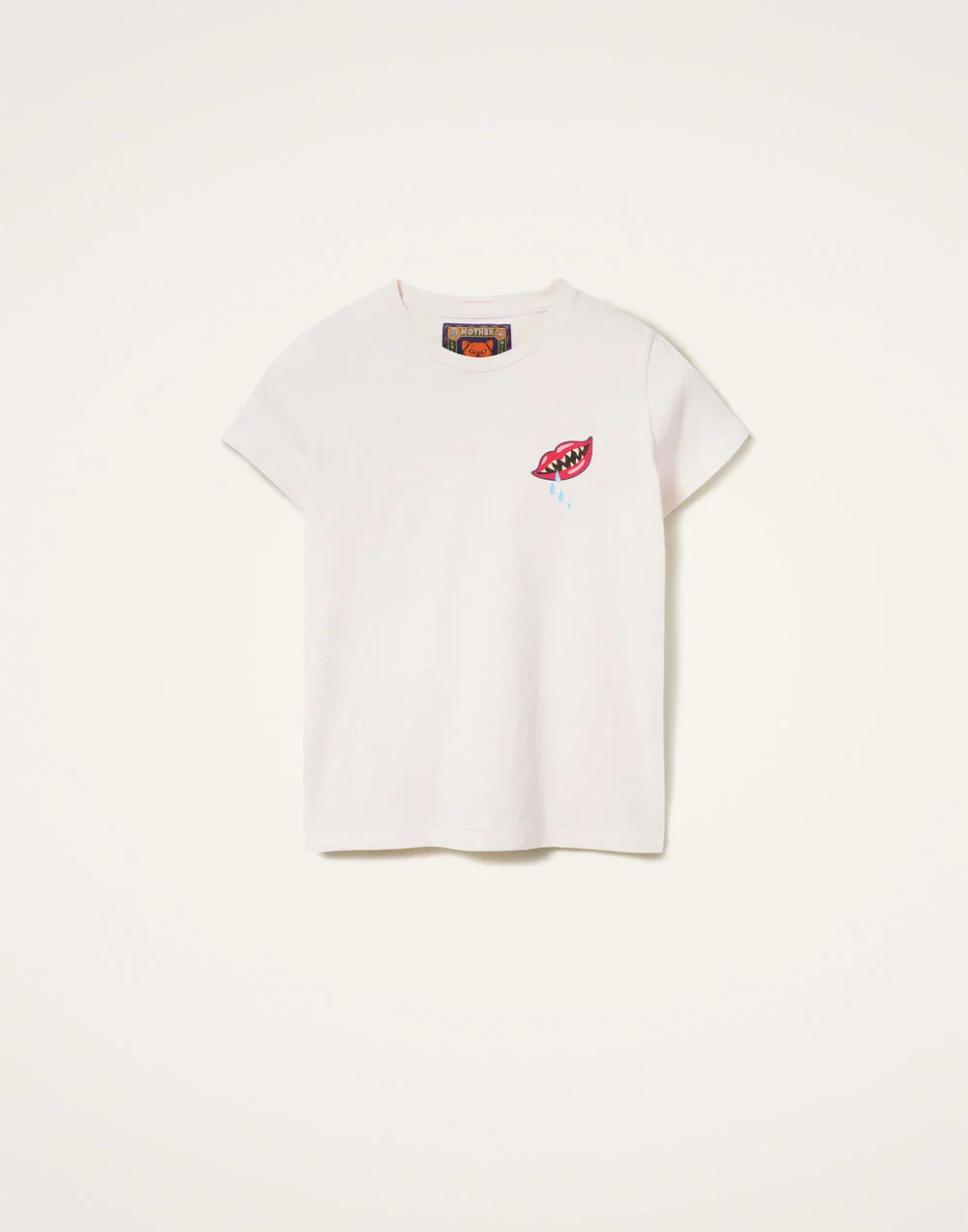 A classic crew with a mood-boosting twist, this tee arrives as part of the Ciao Mamma! collaboration between La Double J and MOTHER. With a slim fit for a vintage look and feel, this white tee comes with a cute twist featuring a printed mouth on the front and embroidered cursive script on the back. Join the team, bella! Details & Fit - LDJ x MOTHER Collection - Slim fit tee - Crew neck - Composition: 100% cotton - The model is 177 cm / 5′ 9.7″ tall and wears a size S