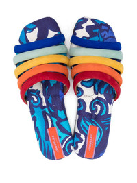Tones cotton-chevron slides A load of vibrating colour decorates the never-boring Tones slides. These rainbow multi-straps flats, here in a cotton-chevron version, can subtly enter a maximalist look or add a pop of colour to a monochrome one. The base is adorned with the Anemone print, a constant across this La Double J’s spring collection that features it in swimwear, hair accessories and more. For a walking-in-the-clouds feeling, they feature a moulded footbed and a suede finish. Highlights - Royal blue/multicolour - Cotton - Calf leather - Calf suede - Branded footbed - Single toe strap - Open toe - Moulded footbed - Slip-on style Made in Italy Composition Suede 100% SIZE & FIT Measurement HEEL 0.98 in(2.5 cm) Sole height 0.78 in(2 cm)