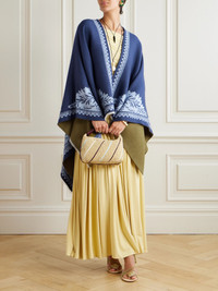 La DoubleJ's collections are an ode to the mood-boosting abilities of pattern and color. This wrap is made from warming wool and silk-blend that's jacquard-woven with an ornate floral border. Drape it over your shoulders when heading out for the evening. Size & Fit - Comfortably fits those who are between a size XSmall-Small - Mid-weight, non-stretchy fabric - Model is 177cm/ 5'10" Model measurements: - Bust: 85cm/ 33.5" - Waist: 62cm/ 24.5" - Hip: 91cm/ 36" Details & Care - Tonal-blue wool and silk-blend jacquard - Slips on - 95% wool, 5% silk - Dry clean