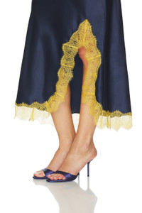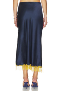 - 100% silk - Made in China - Dry clean - Unlined - Pull-on styling Elastic waistband - Satin textile with lace trims - Side slit detail Item not sold as set - Skirt measures approx 37" in length - Revolve Style No. LLIG-WQ3 - Manufacturer Style No. LLC15137
