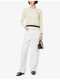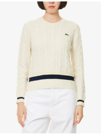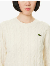 PRODUCT DETAILS - Lacoste stretch-wool blend jumper - 80% wool, 18% polyamide, 2% elastane; embellishments 100% polyester; trims 61% wool, 22% polyester, 16% polyamide, 1% elastane - Regular fit, round-neck, long sleeves, brand patch at front, all-over cable-knit pattern, ribbed striped trims - Machine wash at 30°C - True to size - Model is 5ft 10in/1.78m and wears a size small - Midweight, stretchy Ref: R04473380
