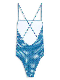 geometric-print criss-cross swimsuit Highlights - Blue/white - Recycled polyester - Geometric print - Applique logo - Square neck - Rear criss-cross straps - Slip-on style - Be mindful to try on swimwear over your own garments. Imported Composition Recycled Polyester 100%