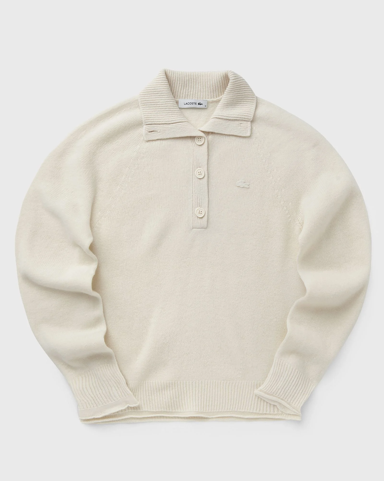 This elegant sweater combines 90 years of Lacoste knitting expertise. Made from heavy, fluffy wool fabric that has been seamlessly processed using state-of-the-art 3D knitting technology, it fits perfectly to the body. The high collar with buttons and subtle roll knit details give it a feminine look. A classic that will see you through all seasons. - Seamlessly knitted jersey wool from animal-friendly sources - Classic fit, comfortable sleeves - Wide 7-gauge knit - High collar with buttons - Roll knit at the neck and cuffs - Color-coordinated embroidered crocodile on the chest Article number: AF4010-XFJ Gender: women Color: LAPLAND Material: 100% Wool