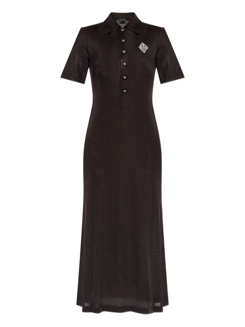 logo-applique dress Highlights - Cedar brown - Front button placket - Polo collar - Short sleeves - Flared skirt Imported Composition Viscose 98%, Elastane 2% SIZE & FIT FittingInformation Designed for a close fit throughout Made from a midweight stretch fabric, this piece offers elasticity and flexibility when worn