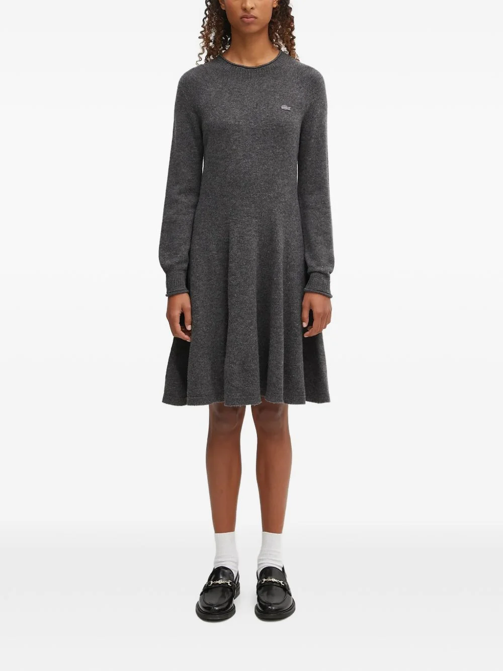 long-sleeve mini dress Highlights - Grey - Crew-neck - Long-sleeves - Logo-applique - Flared hem Imported Composition Wool 100% Washing instructions Machine Wash