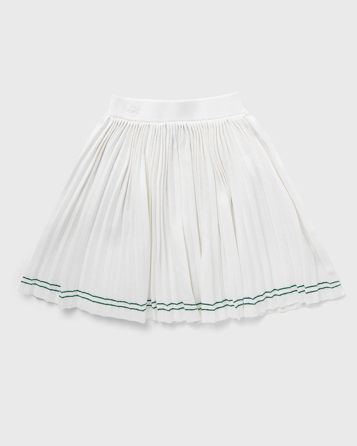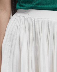 The Lacoste SS25 runway collection creates a link between the beach, summer nights and tennis. It presents a summer wardrobe full of solar energy pieces and light fluidity. - Pleated Knit Skirt - Fluid, lightweight rayon knit - Fully pleated - Contrast stripes at hem - Elasticated waist - Tonal embroidered crocodile at waist Article Number: JF6614-001 Gender: Women Color: white Material: 25% Polyamide, 75% Viscose