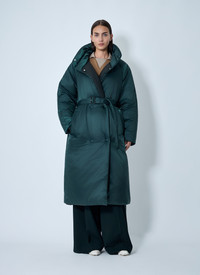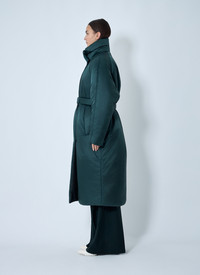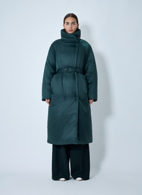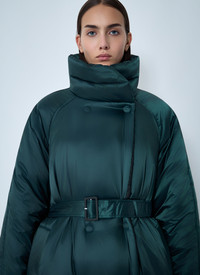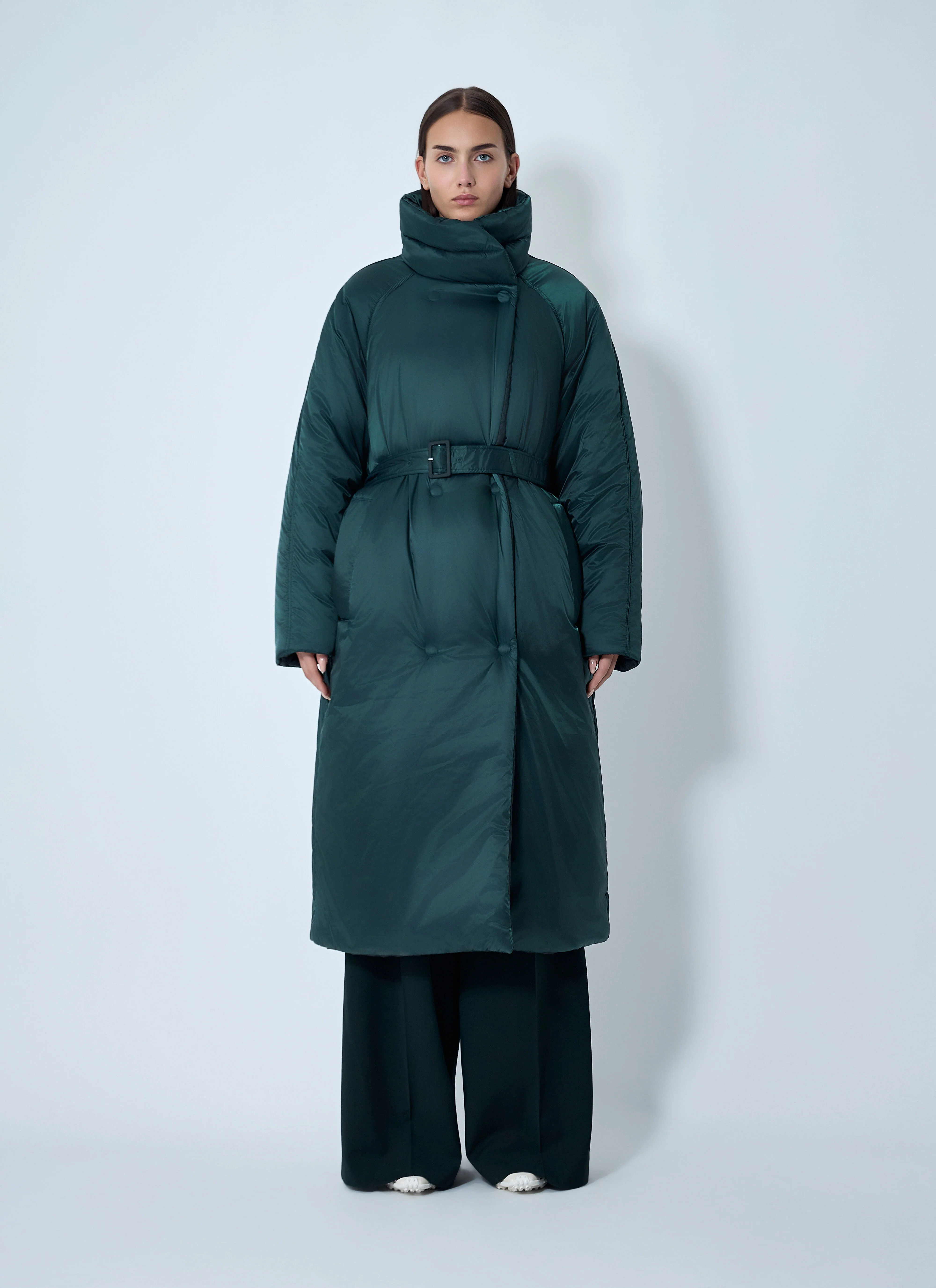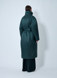 Padded stand collar coat in satin weave. - Stand collar - Front button fastening - Long sleeves - Adjustable belt at waist - Side slip pockets - 100% Technical Fabrication Blend. Dry clean - Color: Green - Code: BF3680 GJP