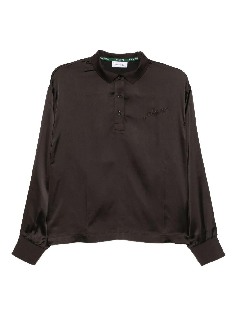 embroidered-logo polo top Highlights - Dark brown - Short front button fastening - Satin finish - Ribbed cuffs Imported Composition Polyester 100%