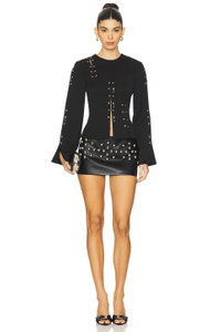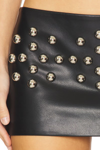- Self: 50% polyurethane 50% polyester Lining: 100% cotton - Made in Georgia - Machine wash - Fully lined - Hidden back zipper closure - Midweight vegan leather with front studded detail - Item not sold as set - Skirt measures approx 10" in length - Revolve Style No. LBOK-WQ12 - Manufacturer Style No. LBRS24SKVLBK05