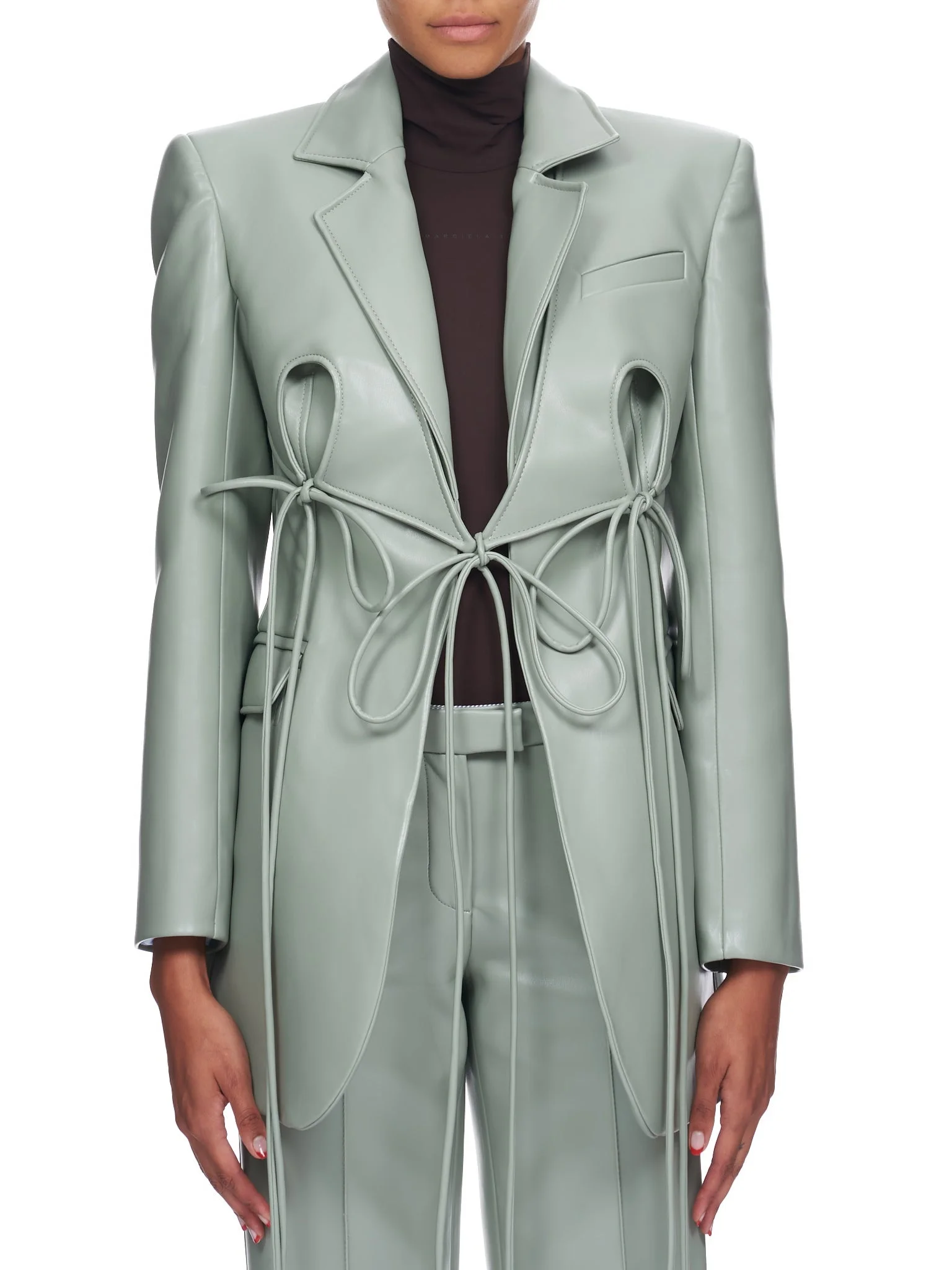 Lado Bokuchava blazer in grey green, vegan leather, lapel collar, padded shoulders, open front with tie closure design, flap pockets, left chest pocket, back layered fabric detail & vent, classic fit, true to size. Made in Georgia Standard Sizing Composition: (Main) 50% Polyurethane, 50% Polyester, (Lining) 100% Viscose Model is 6'0" and is wearing size S. Bust: 33” Waist: 24” Hip: 34.5"