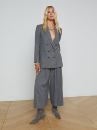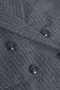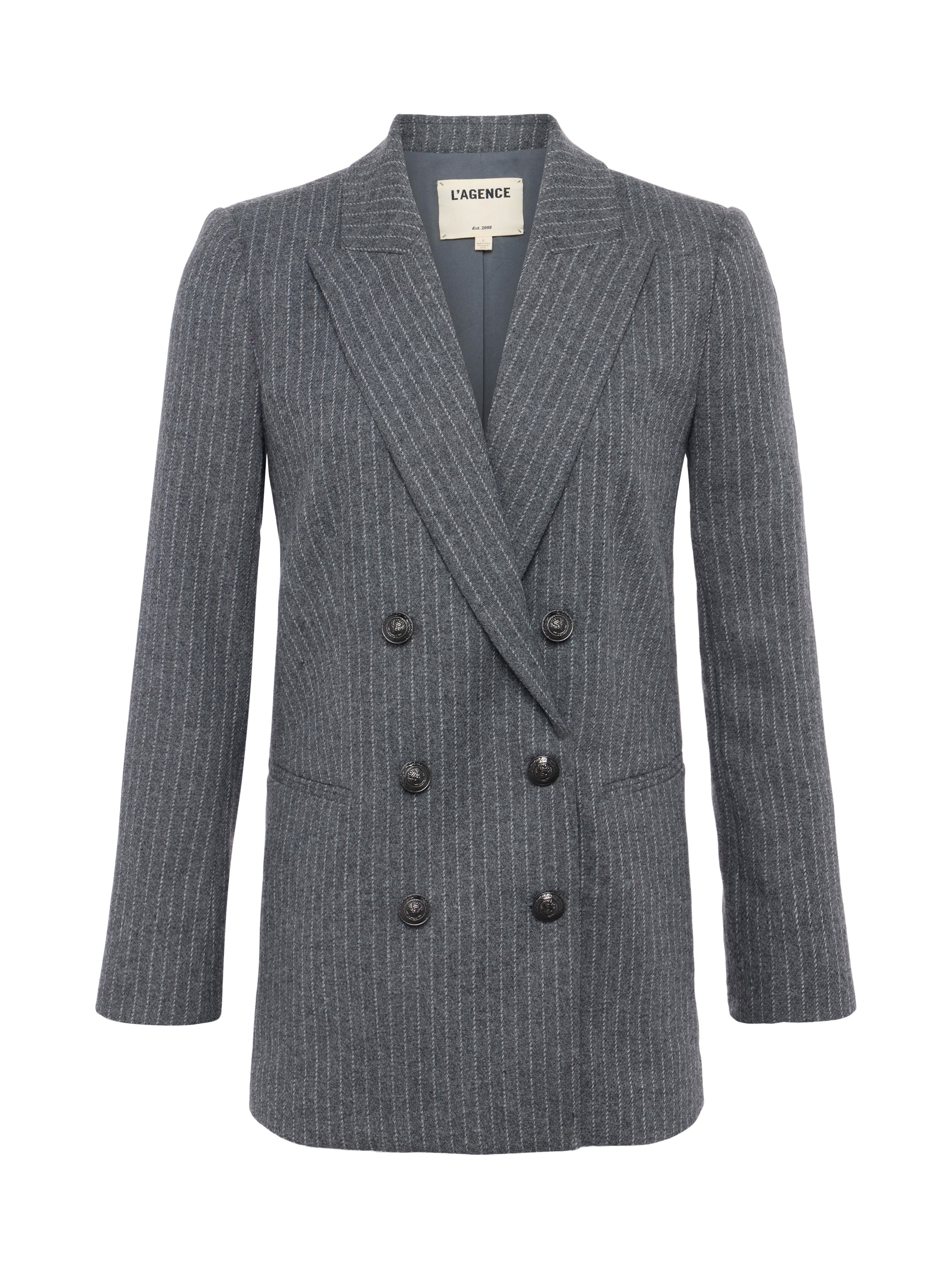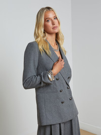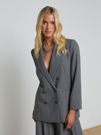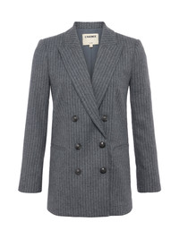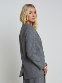 The Aimee blazer features a cool-without-trying oversized fit, now in a menswear inspired pinstripe. • Suiting fabric • Fully lined • Strong shoulder • Double-breasted front closure • Front welt pockets • Embossed dome buttons • Three-button cuffs • Back hem vent Style No. 1915HJW-GYIP DETAILS & FIT - Model Details: Height 5'9" | Bust 32" | Waist 24" | Hips 34" | Wearing Size 2 - About 30" From Shoulder to Hem - Sleeve Length: 23.3" MATERIALS & CARE Composition - 100% Polyester - Imported