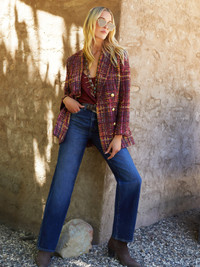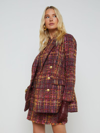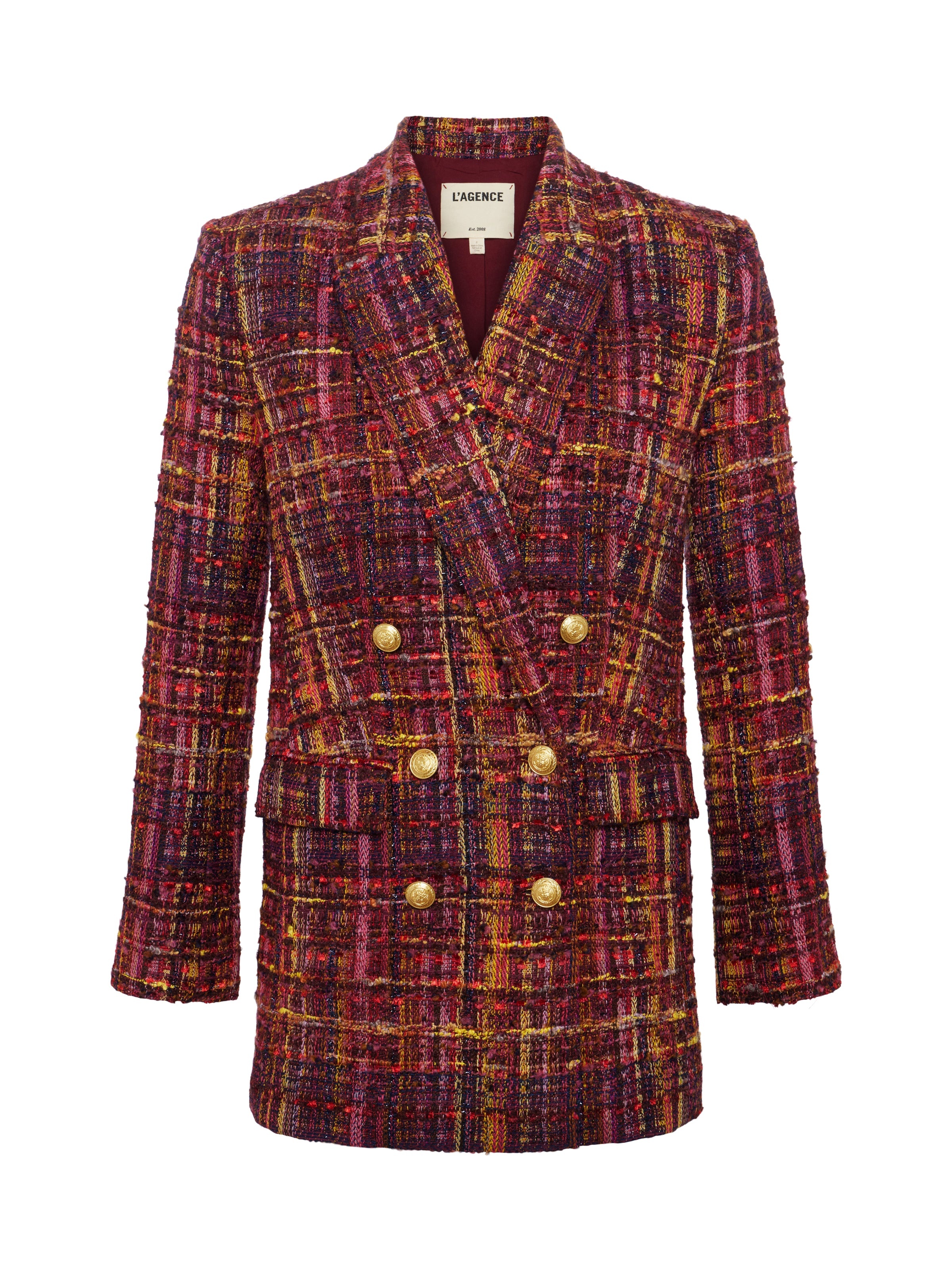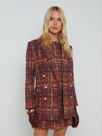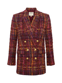 Now in a beautifully rich tweed, the Aimee blazer features a cool-without-trying oversized fit and timeless appeal. • Slub dyed tweed fabric with eyelash and lurex yarns • Fully lined • Strong shoulder • Double-breasted front closure • Front flap pockets • Embossed dome buttons • Three-button cuffs Style No. 1765RJA-RPMT DETAILS & FIT - Model Details: Height 5.9" | Bust 32" | Waist 24" | Hips 34" | Wearing Size 2 - About 30" From Shoulder to Hem - Sleeve Length: 23.5" MATERIALS & CARE Composition - 90% Polyester 10% Wool - Imported Care - Dry clean only