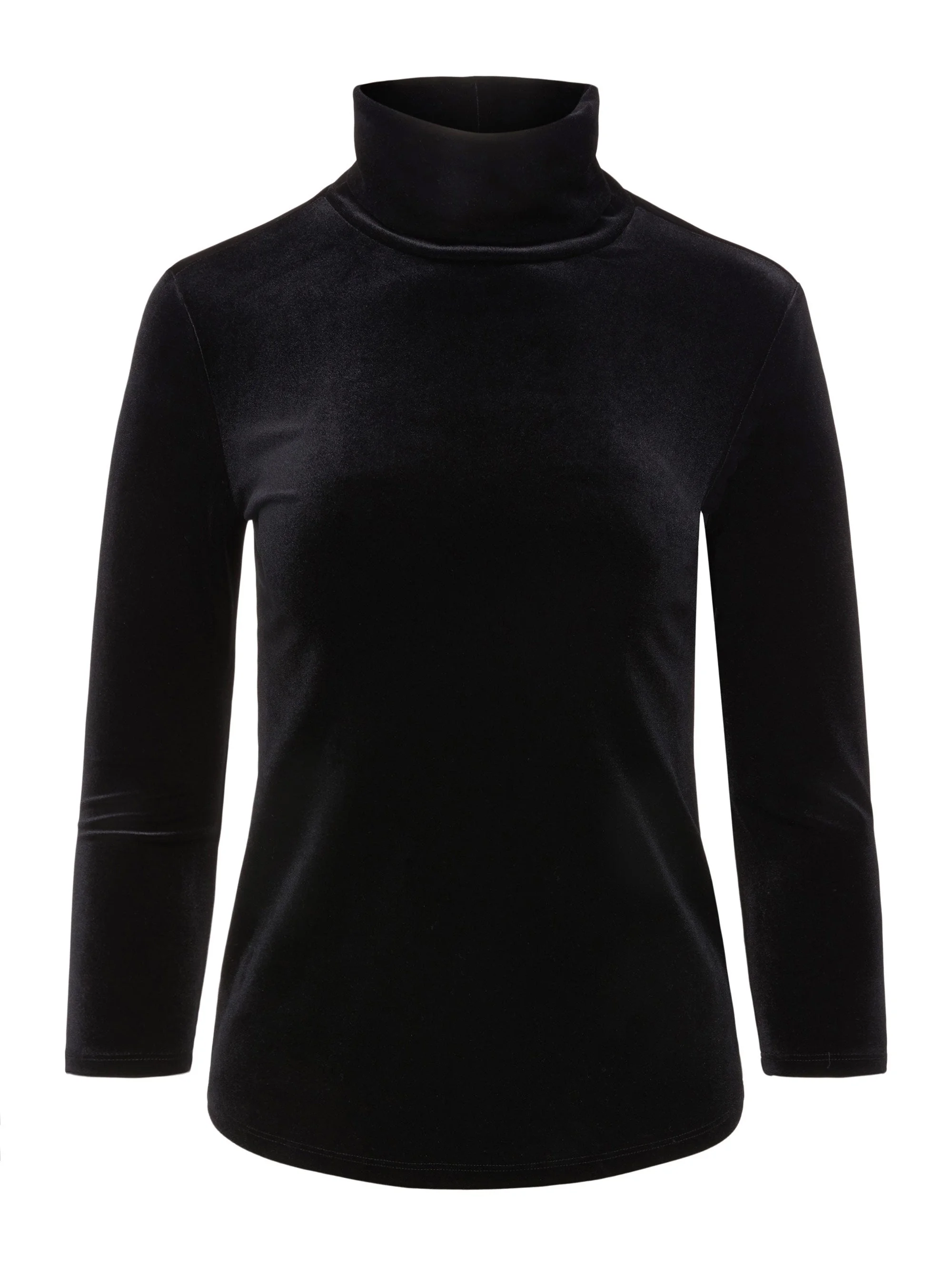 An essential, slim-fit turtleneck top in plush velvet stretch denim and classic black hue. High-stretch fabric has a supple feel and superior recovery that creates a smooth, flattering silhouette. Style finished with a three-quarter length sleeve. Style No. 5495FUW-BLAC DETAILS & FIT - Model Details: Height: 5’10.5" | Bust: 33" | Waist: 24" | Hips: 34" | Wearing a Size XS - About 24.75" From Shoulder to Hem - Sleeve Length: 17.5" MATERIALS & CARE Composition - 90% Polyester 10% Spandex - Imported Care - Hand wash