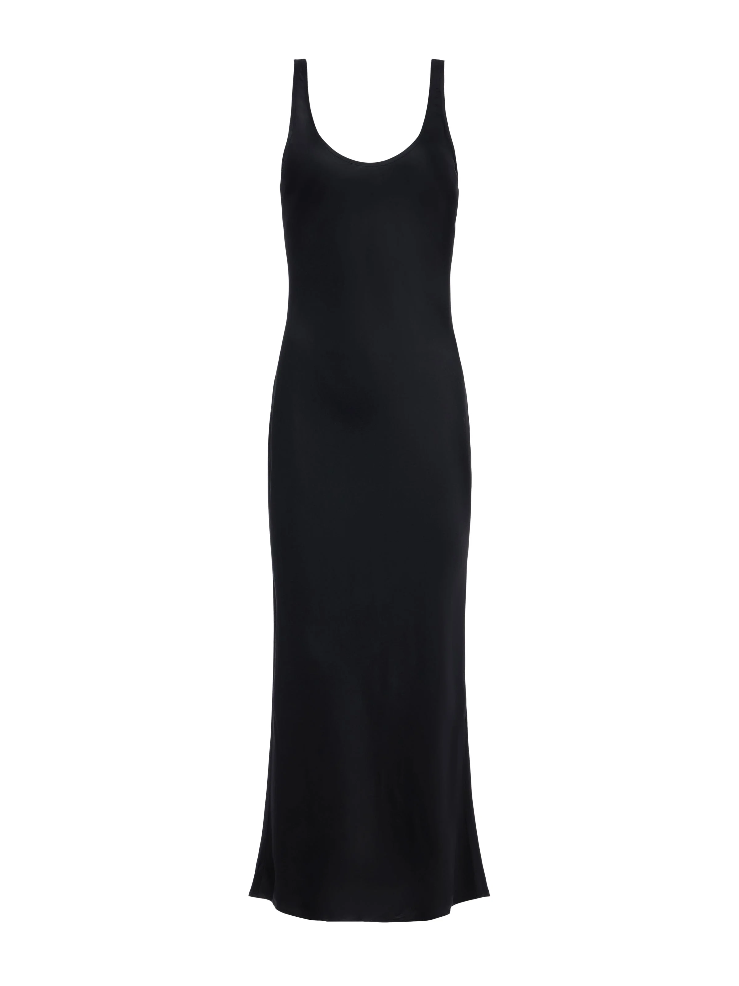 The definition of day to night versatility is the Akiya tank dress—minimal, flattering, and back in timeless black. • Bias-cut satin • Deep scoopneck • No closures Style No. 61120PLY-BLAC DETAILS & FIT - Model Details: Height 5'9" | Bust 32" | Waist 24" | Hips 34" | Wearing Size XS - About 53" From Shoulder to Hem MATERIALS & CARE Composition - 55% Rayon 45% Viscose - Imported Care - Dry clean only - Do not wash - No bleach - No tumble dry - Low iron if needed