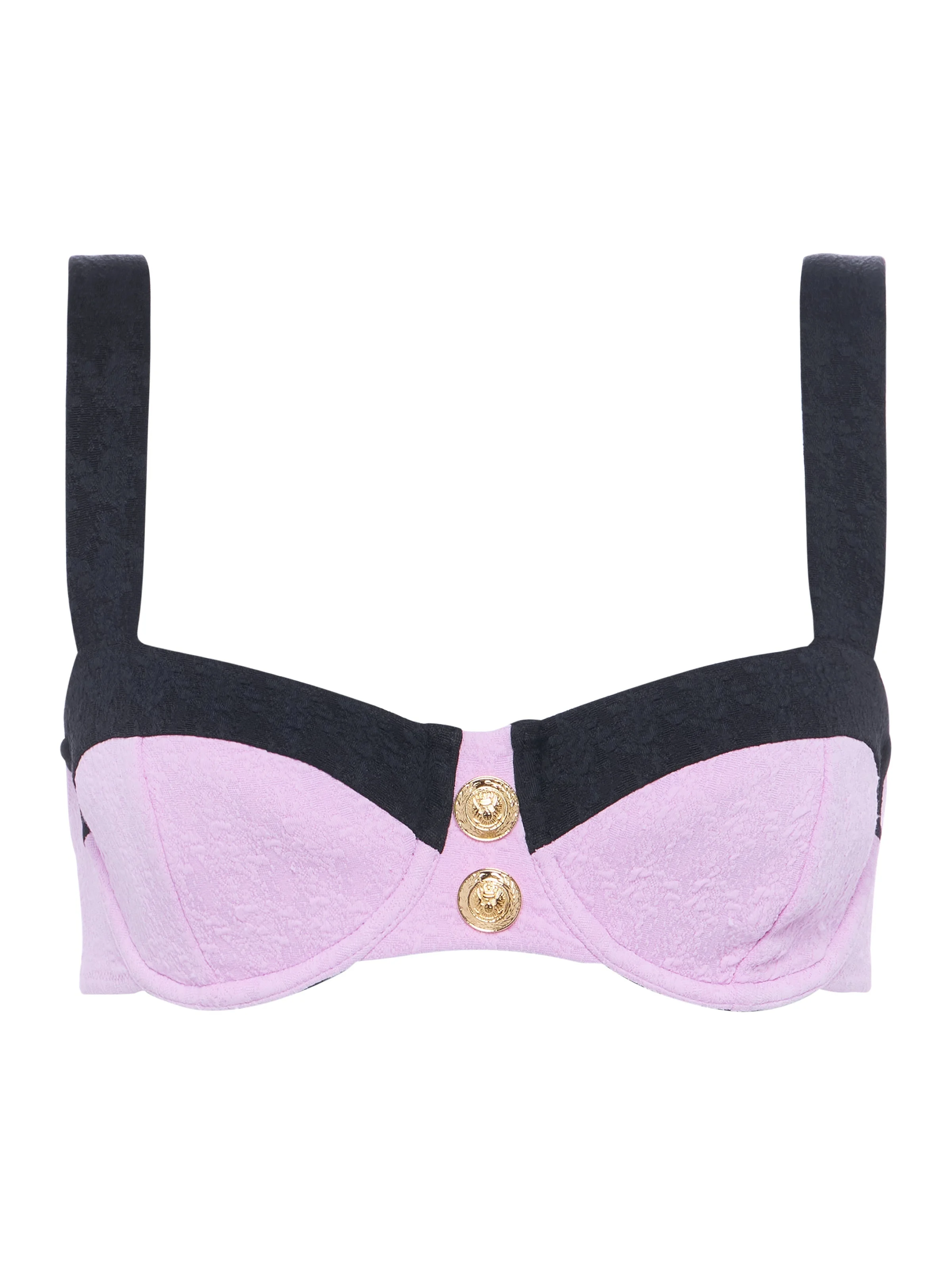 A sweet balconette bikini top, made sweeter with black contrast trim and decorative gold buttons. • Water-safe textured boucle fabric • Underwire • Back hook closure Style No. LG5AM84-LVBK DETAILS & FIT - Model Details: Height 5'10" | Bust 32" | Waist 24" | Hips 34.5" | Wearing Size XS - Adjustable Straps - Removable Cups MATERIALS & CARE Composition - 93% Nylon 7% Spandex - Imported Care - Hand wash