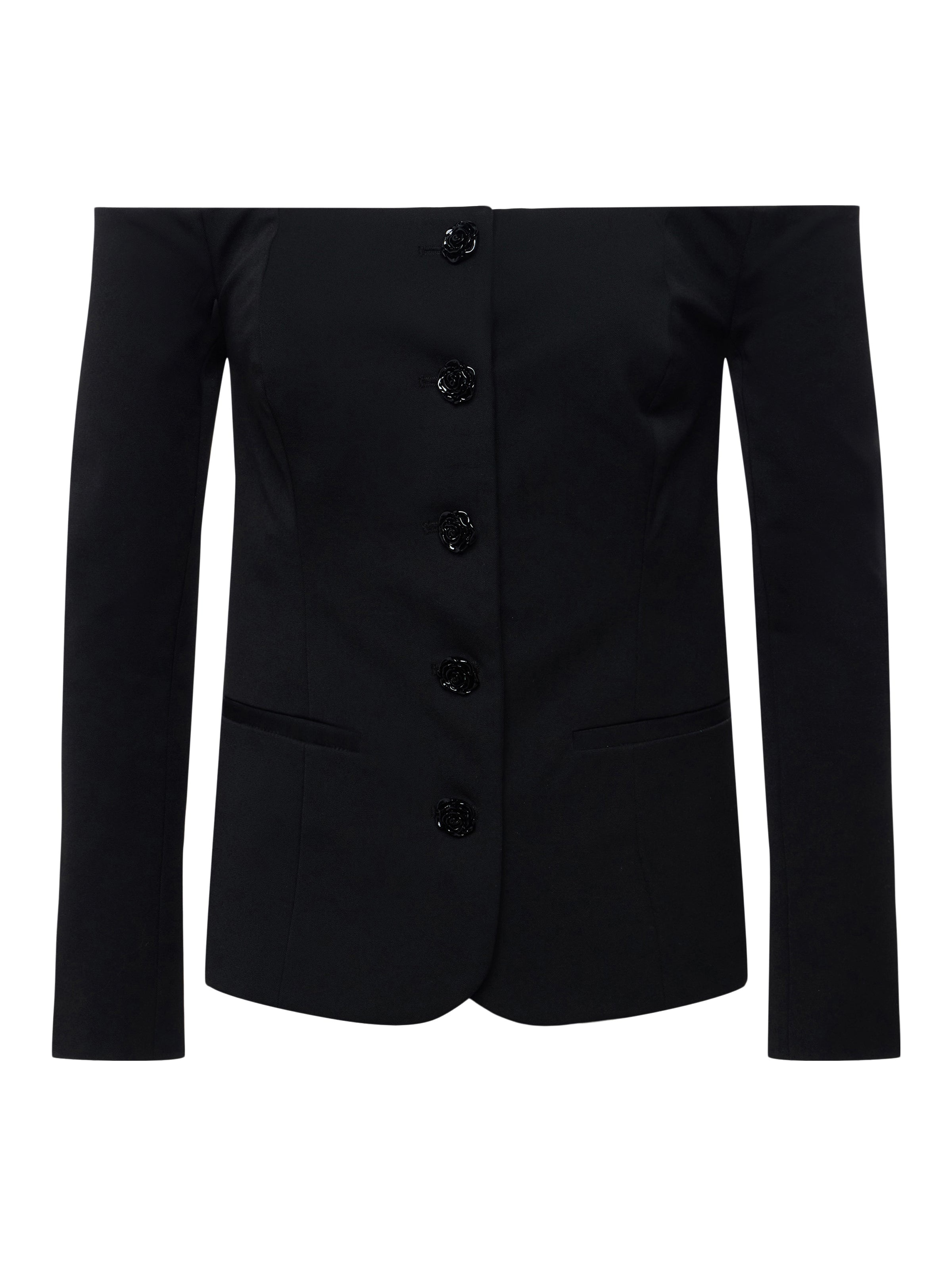 A subtly sexy blazer top designed to mold to the figure for a secure, flattering fit, finished with custom rose buttons. • Italian four-way stretch suiting fabric • Off-the-shoulder design • Structured fit • Single-breasted button closure • 2-button cuffs • Custom rose buttons Style No. 1681NGX-BLAC DETAILS & FIT - Model Details: Height 5'10" | Bust 32" | Waist 24" | Hips 34.5" | Wearing Size 2 - About 17.75" From Top to Hem - Sleeve Length: 19.5" MATERIALS & CARE Composition - 68% Polyester 29% Rayon 3% Spandex - Imported