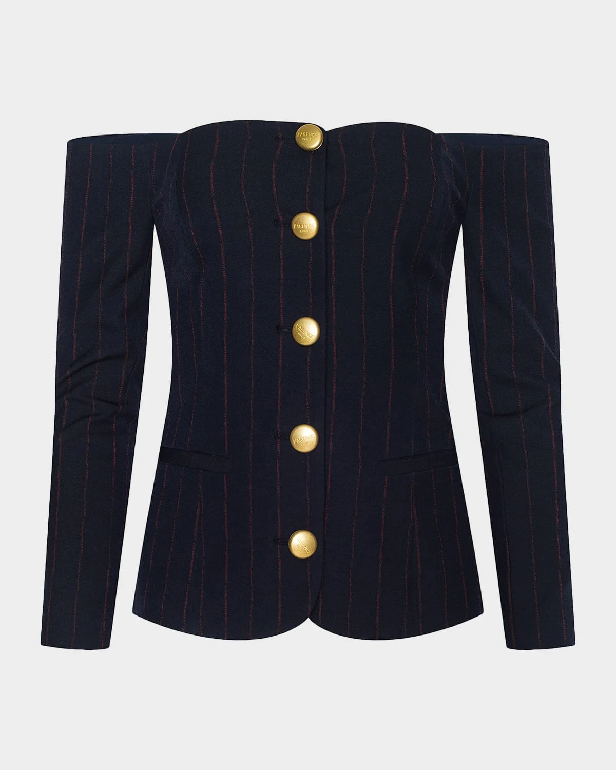 A blazerstyle silhouette, the "Alice" top by L'Agence is crafted from a stretch suit fabric in a classic pinstriped pattern Approx. 17.5"L from shoulder to hem Offtheshoulder neckline; singlebreasted front Long sleeves Front welt pockets Tailored fit Hip length Polyester/Proviscose® rayon/spandex Dry clean Imported