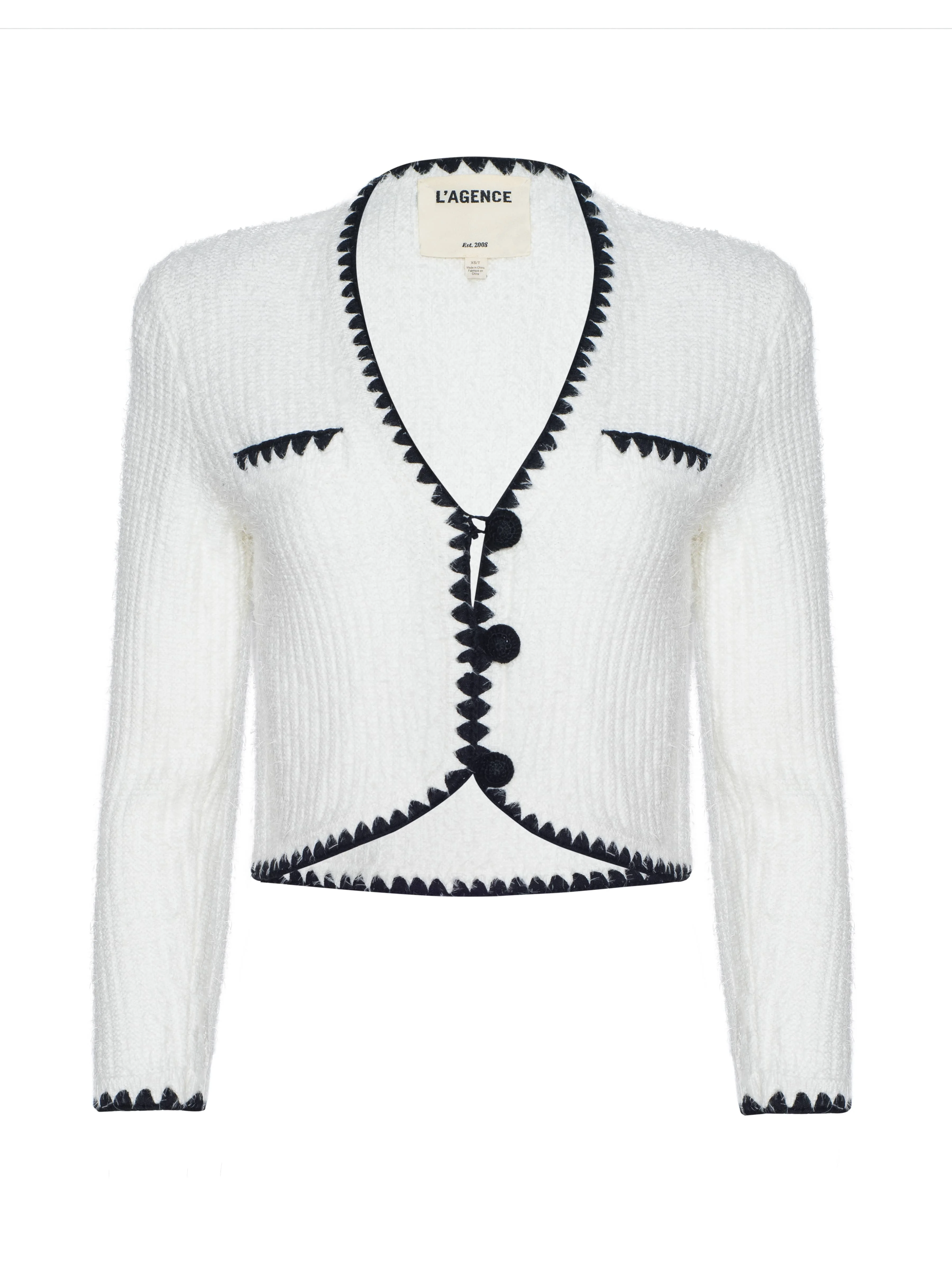 Style No. 80106SPO-WHBL DETAILS & FIT - Model Details: Height 5'10" | Bust 34" | Waist 24" | Hips 35" | Wearing Size XS - About 18.5" From Shoulder to Hem - Sleeve Length: 21" MATERIALS & CARE Composition - 46% Nylon 32% Cotton 22% Acrylic - Imported Care - Dry clean only